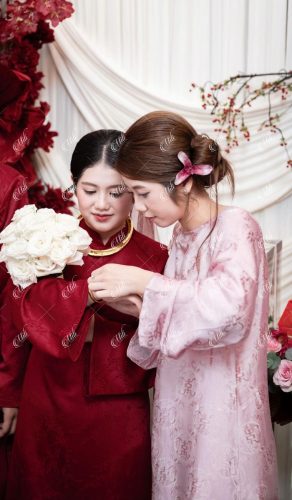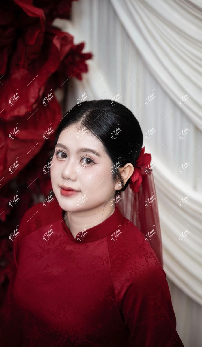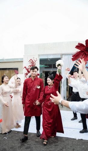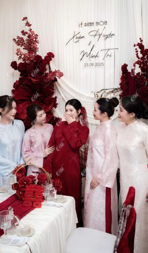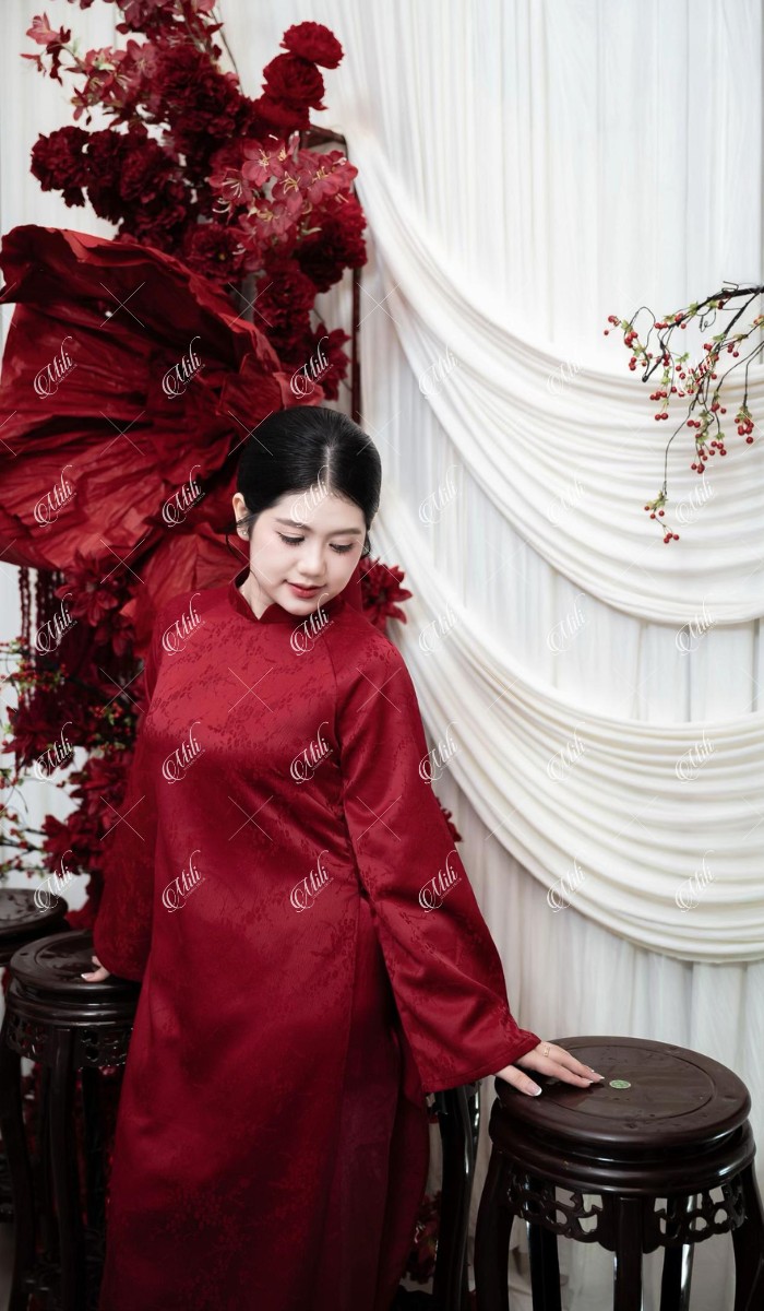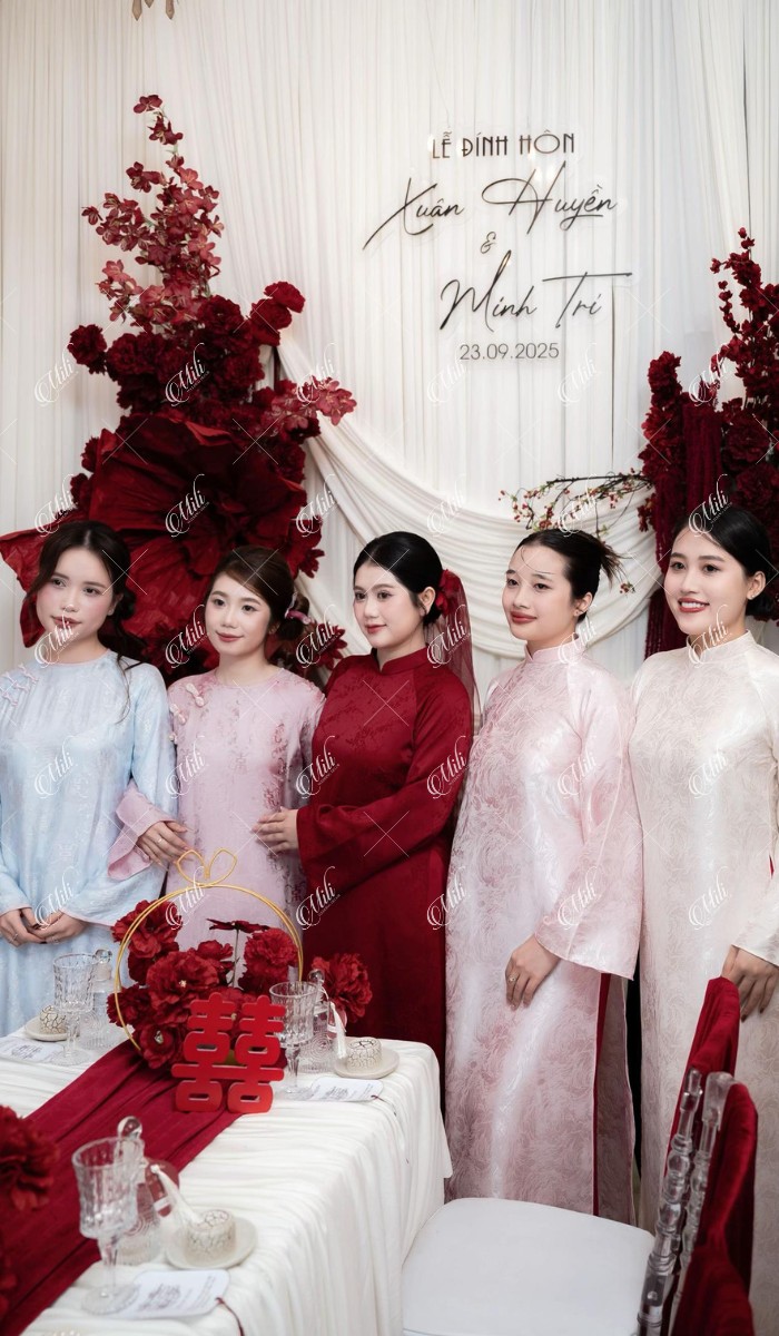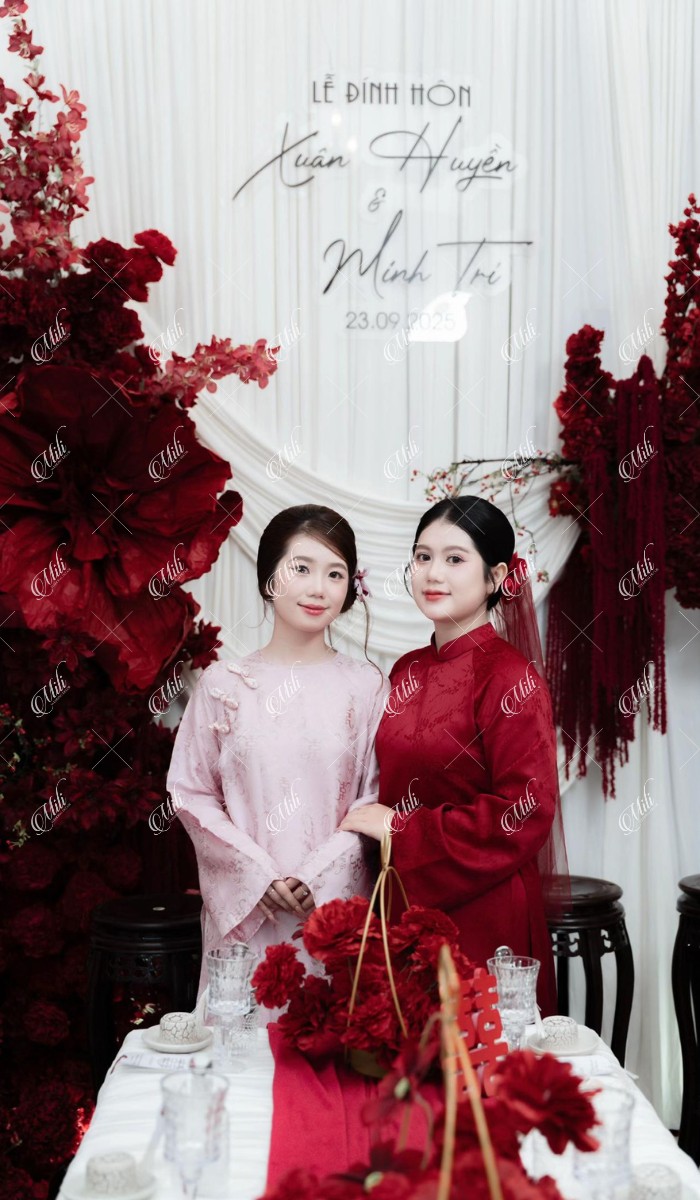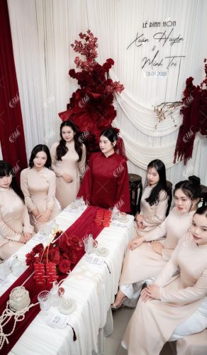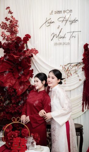 Điểm đặc trưng của thiết kế nằm ở phần phông vải draping (xếp lớp mềm), kết hợp hoa đỏ đậm bố trí theo cụm lớn, giúp không gian có chiều sâu nhưng không bị nặng nề. Tổng thể mang lại cảm giác sang trọng theo hướng tối giản, phù hợp với những gia đình yêu thích sự tinh tế và gọn gàng.