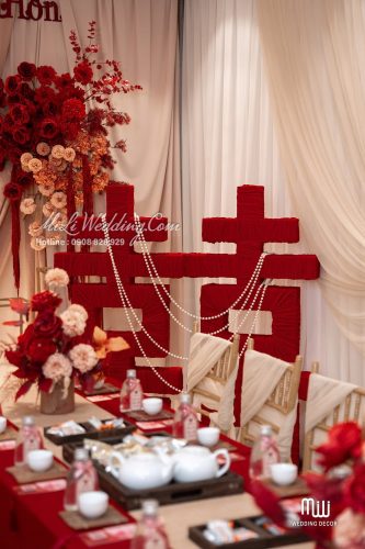 - Cặp chữ Song Hỷ được thiết kế riêng, bọc vải nhung cao cấp, kết hợp dây ngọc trai đính thủ công, tạo điểm nhấn mang giá trị biểu tượng.