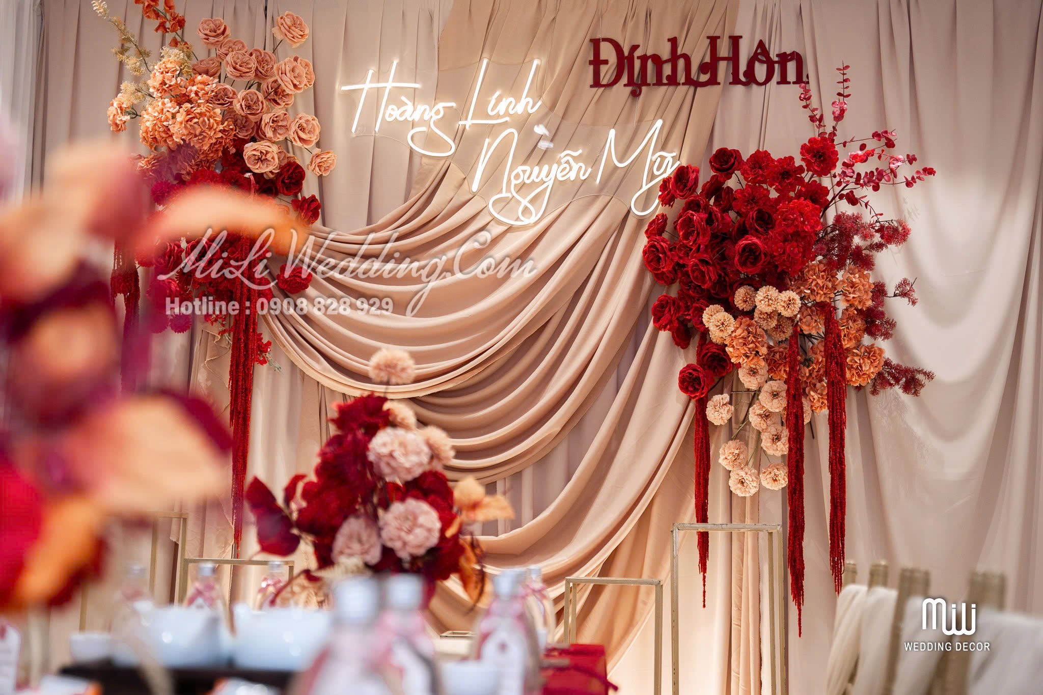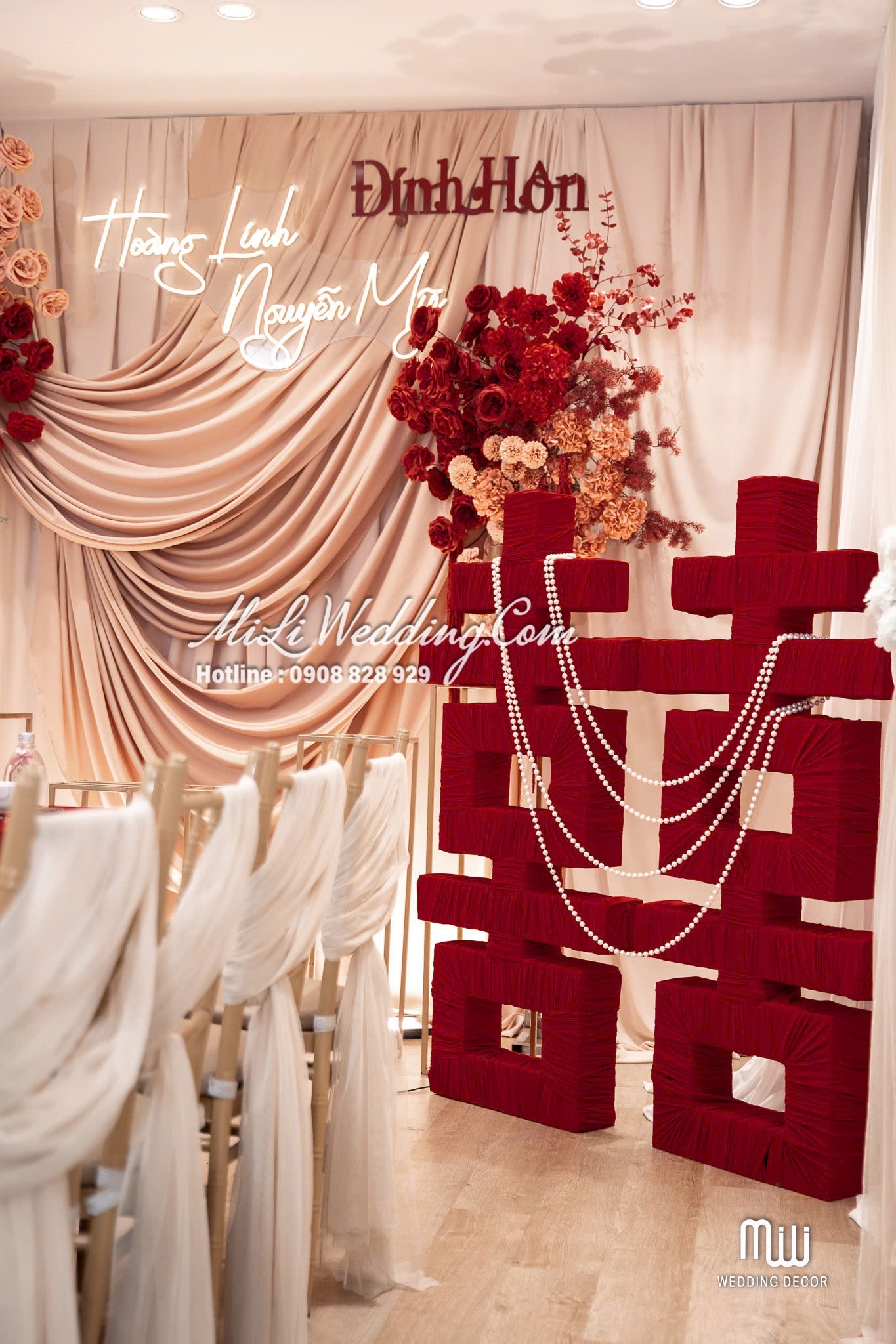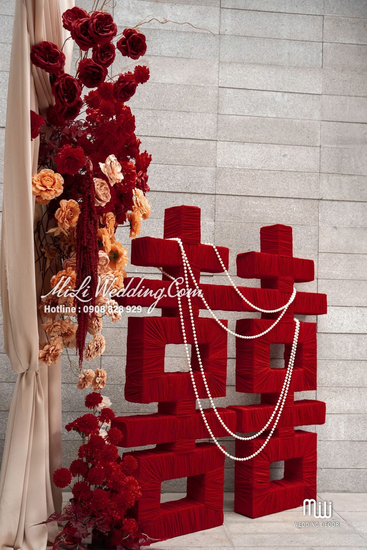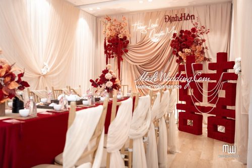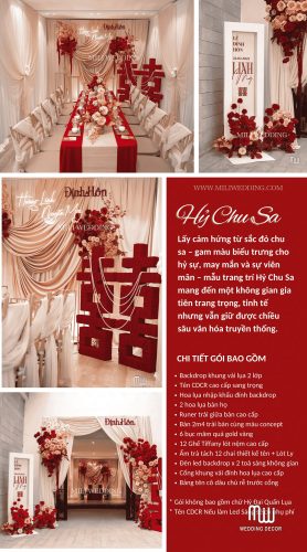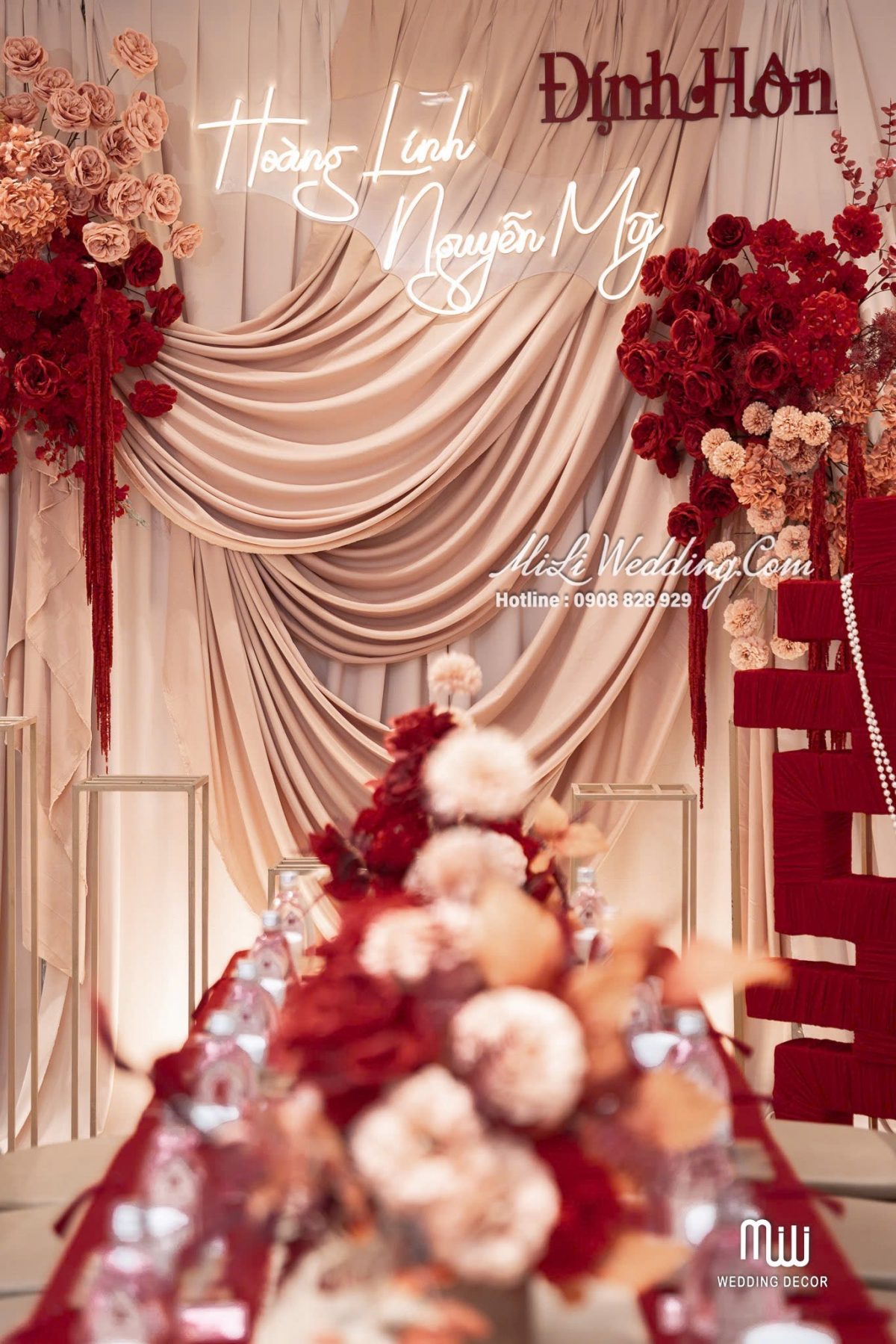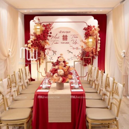 HỶ CHU SA TREND VẢI được Mili Wedding xây dựng dựa trên tinh thần mềm mại, cảm xúc và hiện đại, mang đến một concept trang trí gia tiên đỏ rượu nude vừa sang trọng vừa ấm áp. Sắc đỏ rượu mang lại cảm giác sâu lắng và trang trọng, trong khi nền nude nhẹ nhàng giúp tổng thể trở nên thanh thoát và cân bằng. Sự kết hợp này tạo nên một không gian lễ gia tiên đầy cảm xúc ngay từ ánh nhìn đầu tiên.