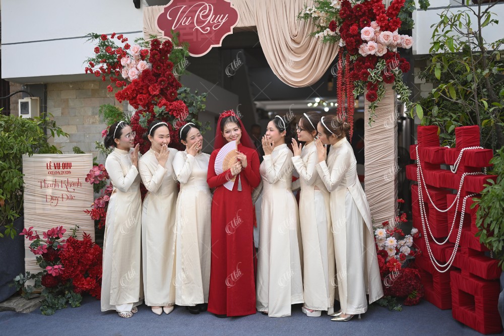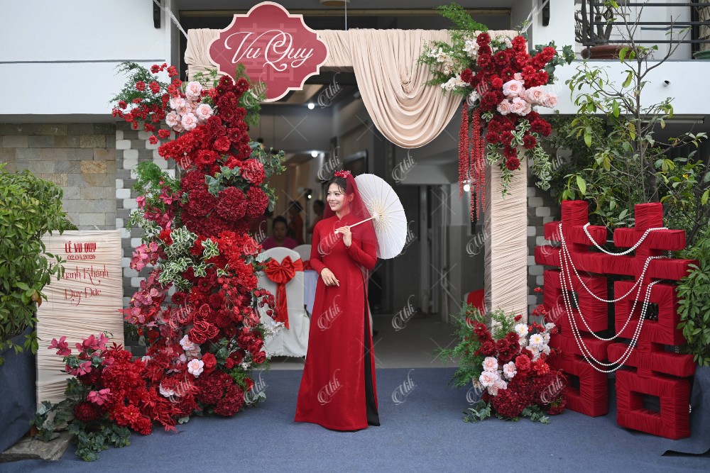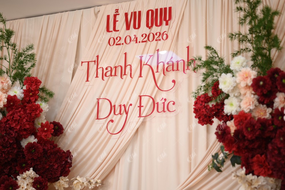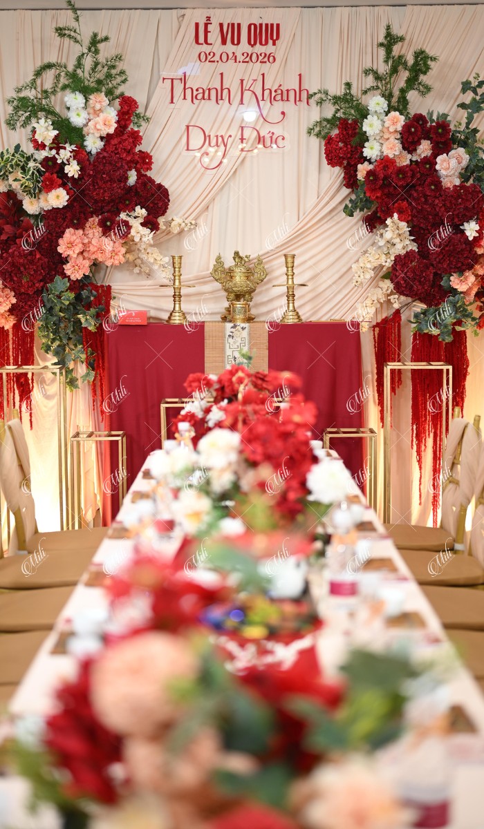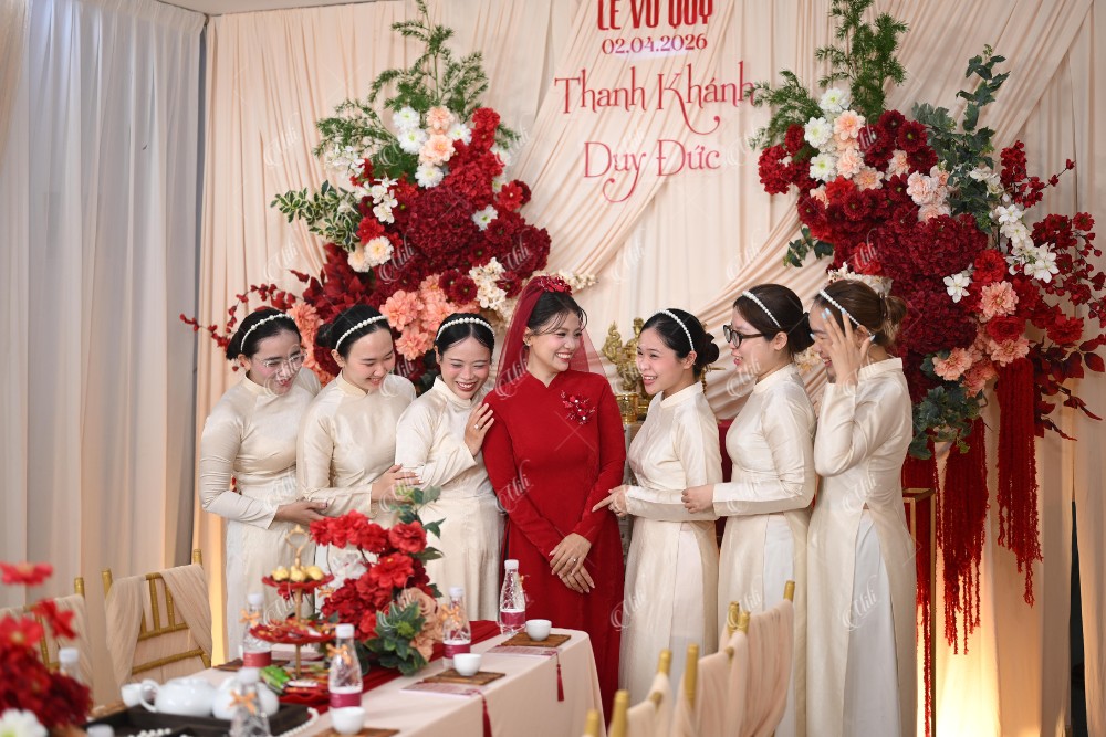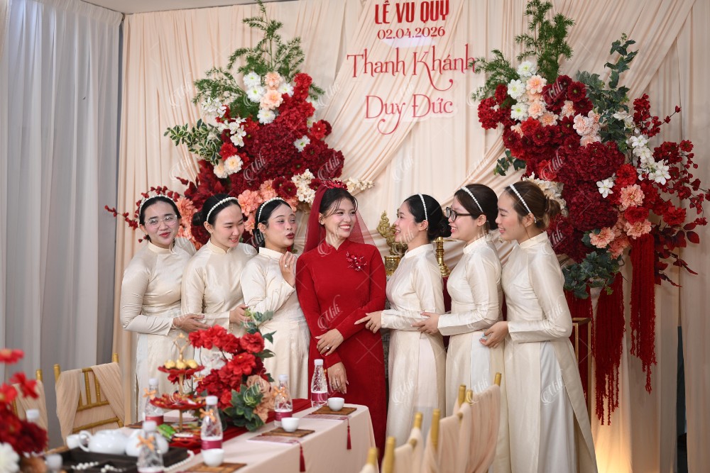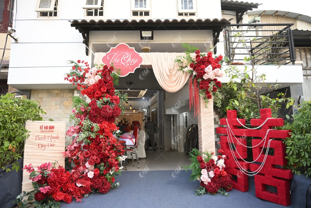 Không gian không chỉ dừng lại ở sự chỉn chu cho nghi lễ gia tiên, mà còn được tính toán để lên hình đẹp ở mọi góc máy — từ bàn lễ, backdrop cho đến khu vực đón khách — giúp từng khoảnh khắc trong ngày trọng đại đều trở nên nổi bật và đáng nhớ.
