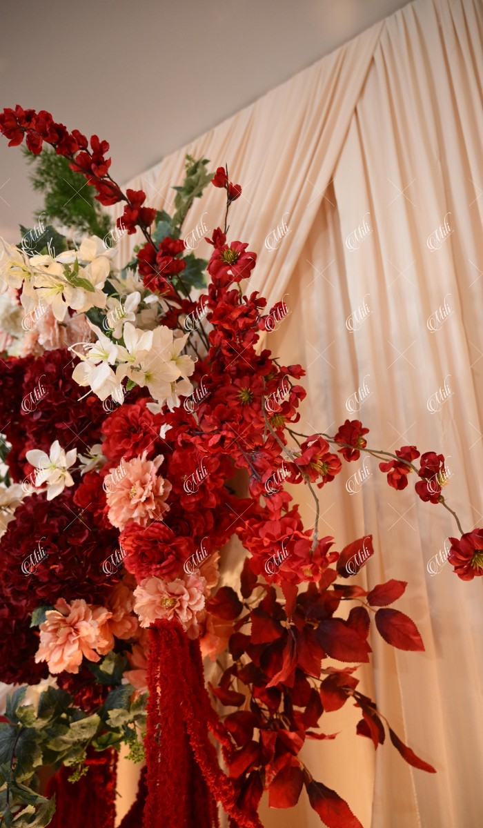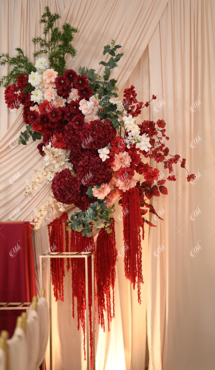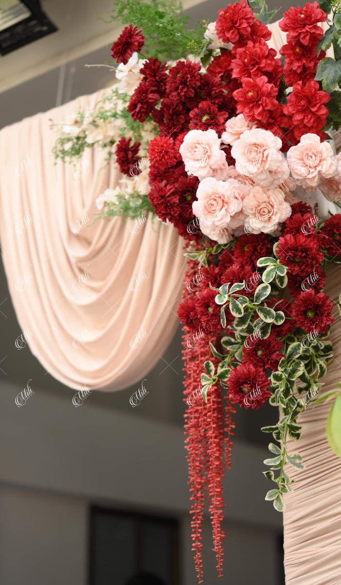 Điểm nhấn của concept nằm ở cách xử lý bố cục giàu chiều sâu: lớp vải lụa rũ được tạo hình mềm mại như những đường chuyển động, kết hợp cùng cụm hoa thiết kế nổi khối với sắc độ đậm – nhạt đan xen. Tất cả tạo nên một tổng thể có điểm nhấn rõ ràng nhưng không rối mắt, vừa sang trọng vừa có “chất” riêng.